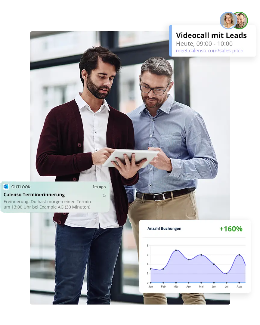 Schluss mit lästigem E-Mail hin und her und Doppelbuchungen. Bieten Sie Ihren Kunden die Möglichkeit, Ihre Beratung online zu buchen, rund um die Uhr. Mit Calenso sparen Sie im Durchschnitt 10 Minuten pro Termin.